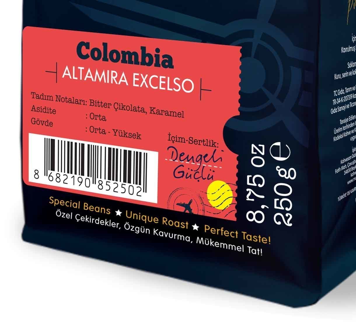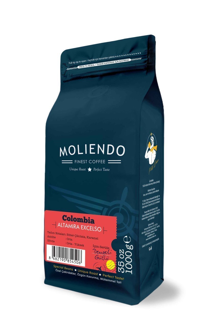 Moliendo Colombia Altamira Excelso, Supremo kahvesi ile aynı ağaçlardan toplanır. İçinde peaberry çekirdekleri de barındırır. Sadece 17 elek boyutlarında olan Supremo'ya göre 15-16 elek boyutundaki çekirdeklerden olşur. Excelso anlam olarak export (ihraç) edilecek kahve anlamı taşımaktadır. Supremo ile benzer tadım karakterinde olmasına rağmen daha ekonomik fiyatıyla Kolombiya'dan en çok ihraç edilen kahve cinsidir. Tatlı karamel aromaya sahip, dengeli gövdesi olan bir yöresel kahvedir.