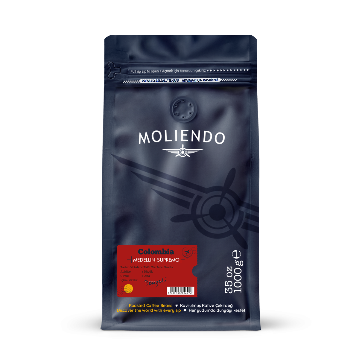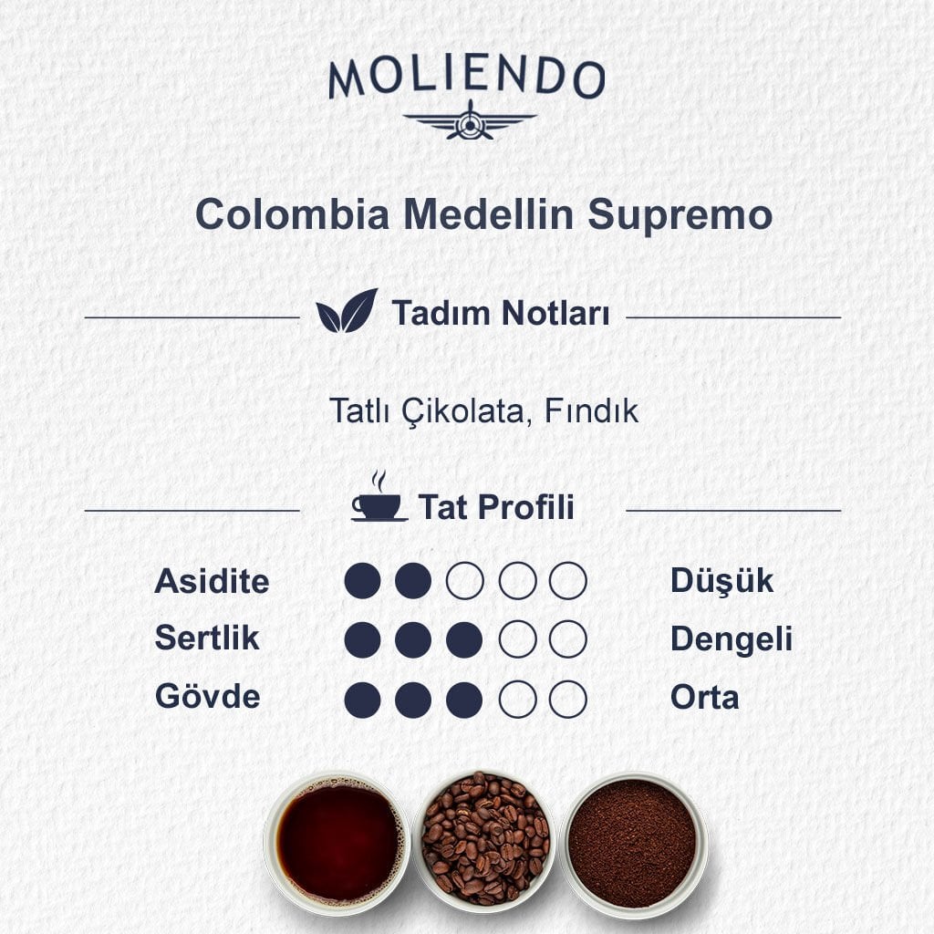 Moliendo Colombia Supremo'nun, Supremo çekirdekleri, yöresel kahveler içinde sert gövdesiyle homojen kavrulabilen ender kahve çeşitlerinden biri olarak bilinir. Çikolata, kahverengi şeker, kakao aromalarının baskın olduğu Colombia Supremo Medellin filtre kahve ve espresso için aranan bir kahve tipidir. Sert çekirdek yapısından ötürü aromasını ve tazeliğini uzunca bir süre saklayabilir.