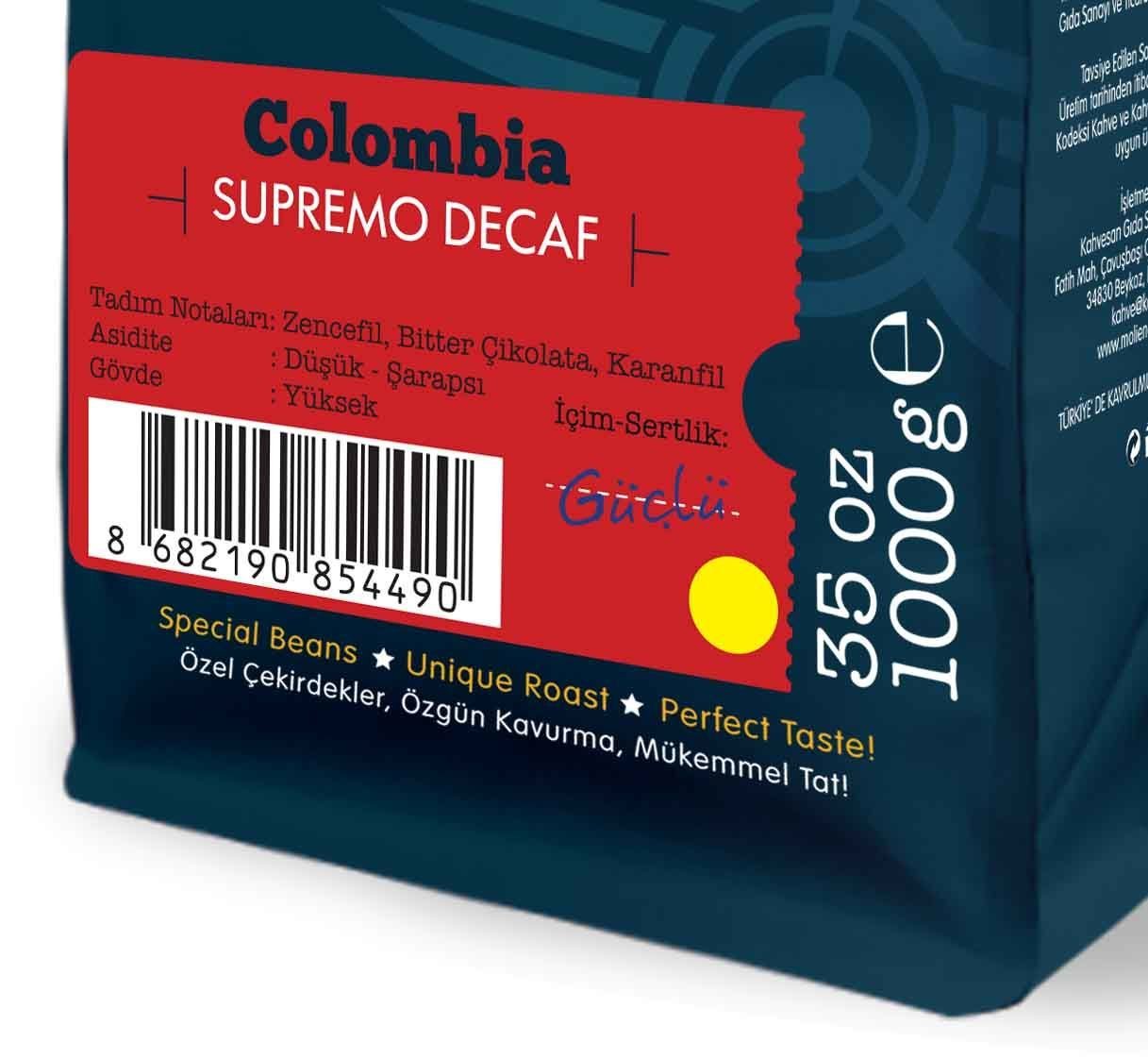 Medellin bölgesine ait 17/18 elek ölçüsüne sahip supremo çekirdekler sıvı karbondioksit yöntemiyle kafeinden ayrıştırılır. Bu esnada kahve aroma ve tadından bir şey kaybetmez. Bitter çikolata, zencefil ve karanfil tatlarıyla klasik bir Latin Amerika kahvesini uykudan hemen önce bile içebileceksiniz.