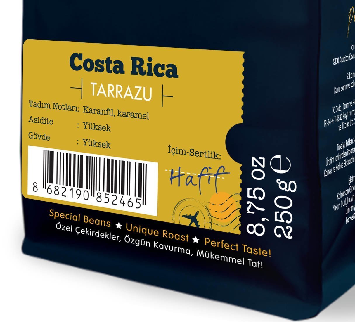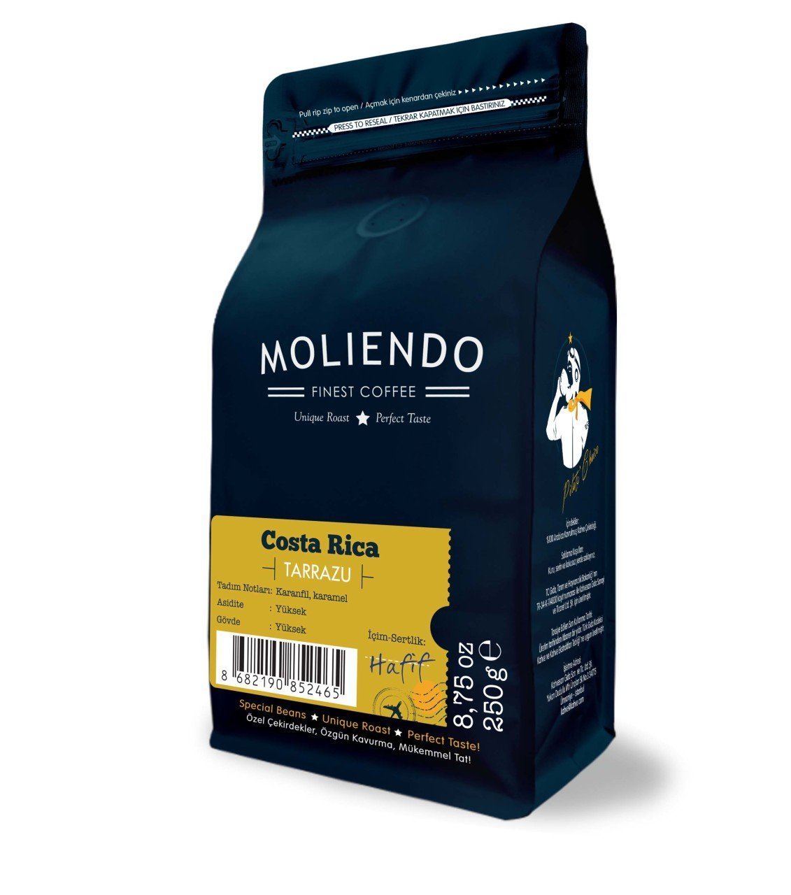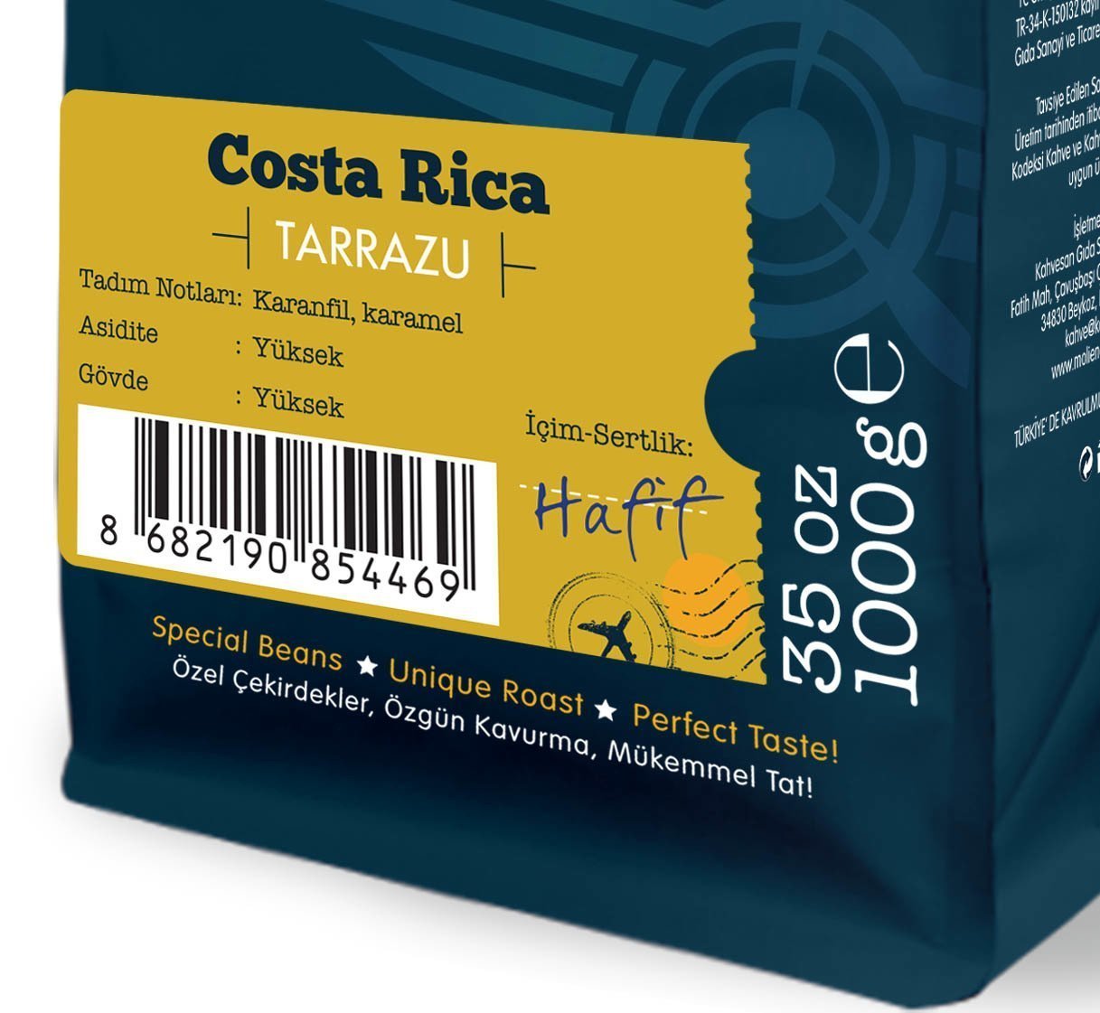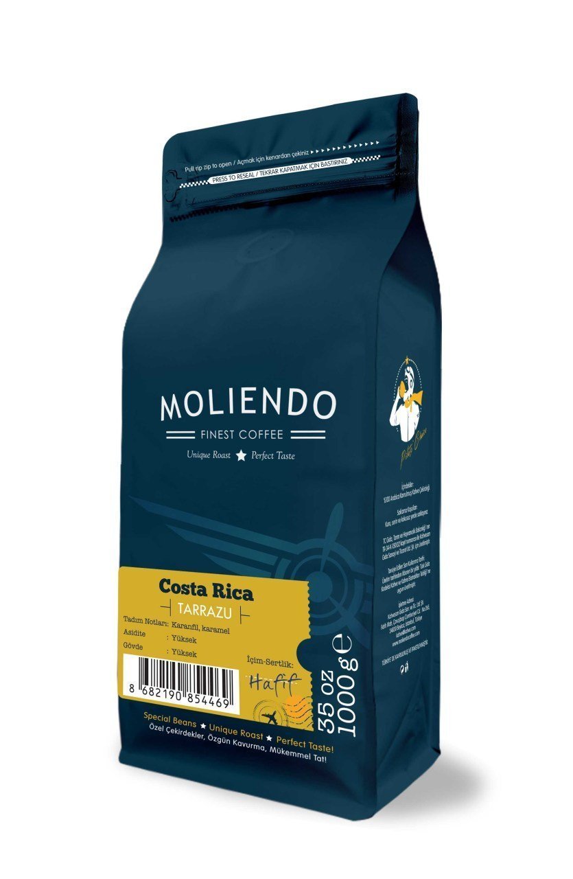 Moliendo Costa Rica Tarrazu, Kosta Rika'nın olgun ve temiz görünüme sahip %100 arabica çekirdeklerinden hazırlanmıştır. Limon, yeşil limon, çikolata, karamel ve kırmızı meyvelerin notalarının yer aldığı bir aromaya sahiptir. Yumuşak ve rahat içimi kendine has, özgün aroması ile dünyadaki nadide, gurme lezzetlerdendir. Sahip olup kuvvetli asiditesi nedeniyle Merkez Amerika kahveleri arasında en çok tercih edilenlerden biridir. Kosta Rika kahveleri genel olarak yetiştirildiği çiftlik ve arazi ile tanımlanır.