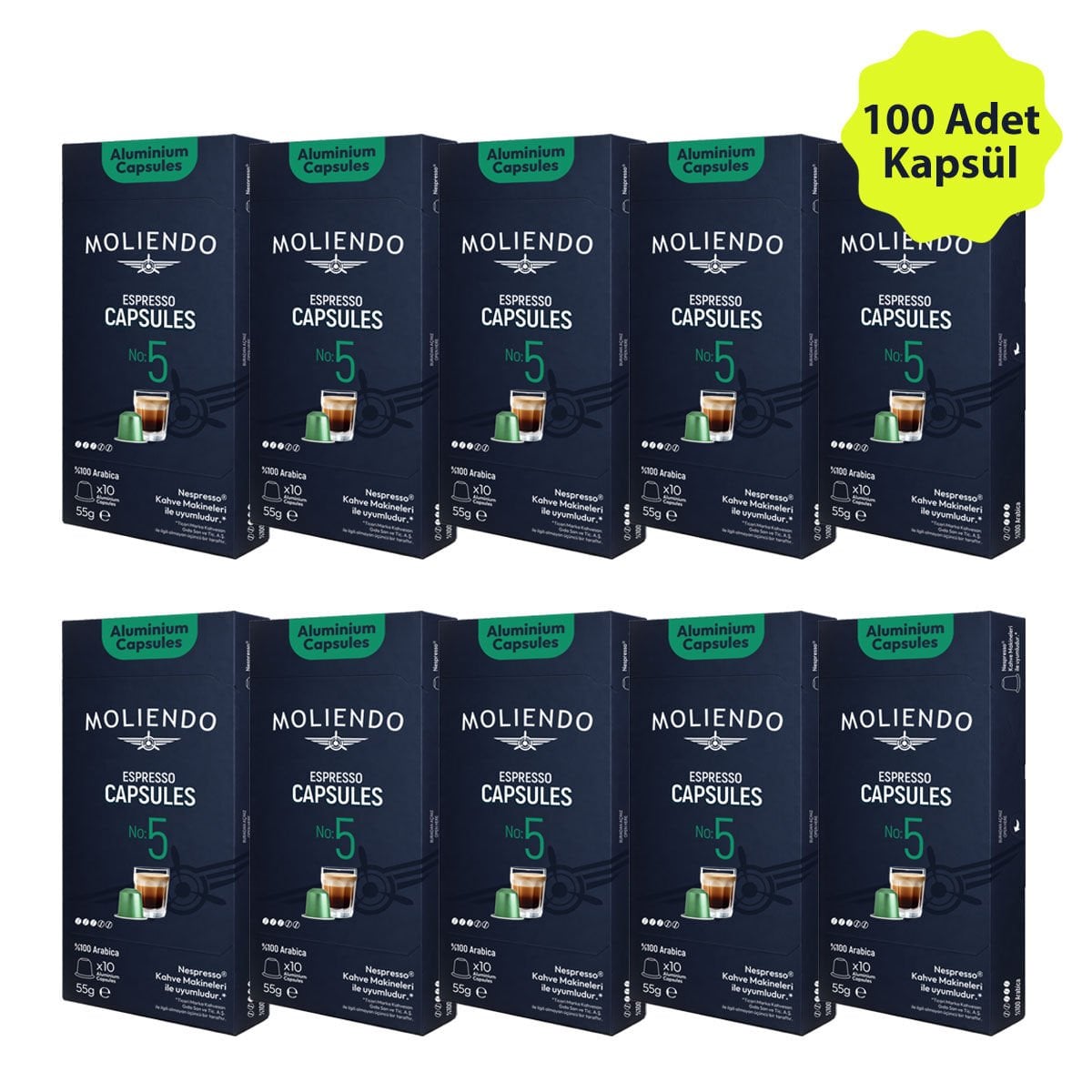 Moliendo Kapsül No:5 Avantaj Paketi 10x10 Nespresso Uyumlu Alüminyum Kapsül 100 Adet
